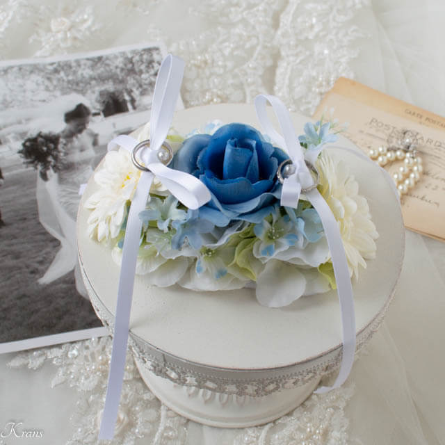 ■商品説明:ブルーローズの花言葉は、「夢かなう・奇跡」素敵な意味を持つお花です。美しいブルーローズをメインフラワーに、左右にはライトブルーローズを上下にはブルースターを合わせました。斑入りのグリーンリーフやレースフラワーが、気品あるリングピローを引き立てています。