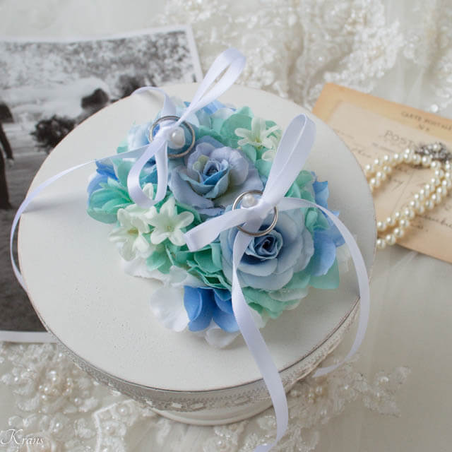 ■商品説明:グラデーションのあるライトブルーローズをメインに、エメラルドグリーンの美しいあじさいを贅沢にたっぷりと使用しました。小花が可愛いホワイトライラックをポイントに添えたリングピローです。