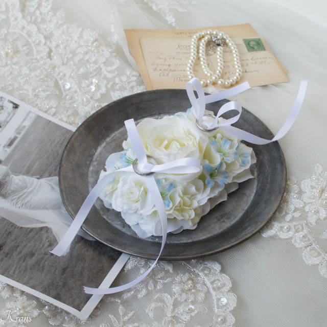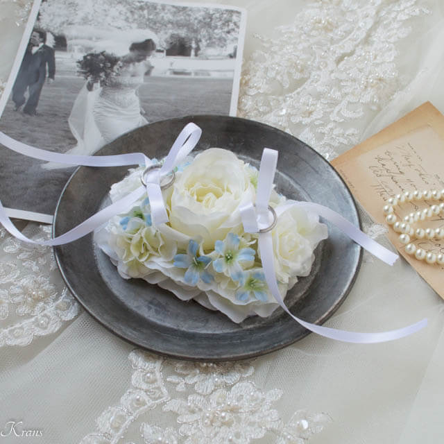 【完売いたしました】ホワイトローズとライトブルーライラックのリングドッグ用リングピロー