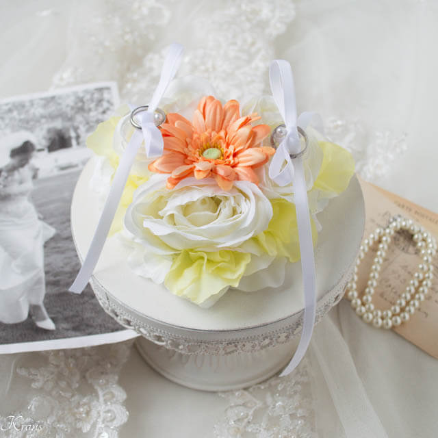■商品説明:発色の美しいオレンジガーベラをメインフラワーに、ホワイトローズを3輪添え、そのまわりに華やかなイエロースイートピーを合わせました。ベースのホワイトあじさいが色味を引き立てる幸福感あふれるハート型のリングドッグ用リングピローです。