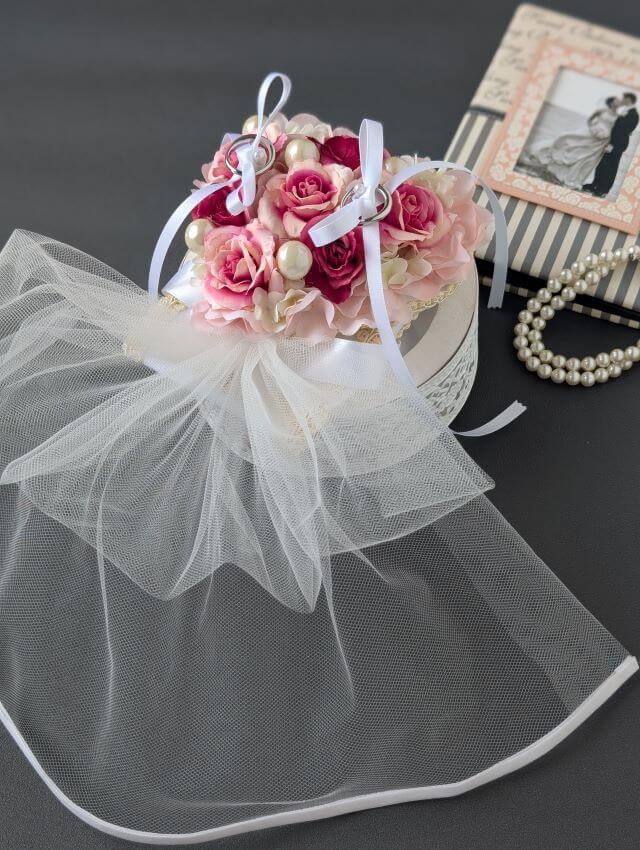■商品説明:濃淡の美しいピンクローズを重ね、ハート型に仕上げた華やかなリングピロー。