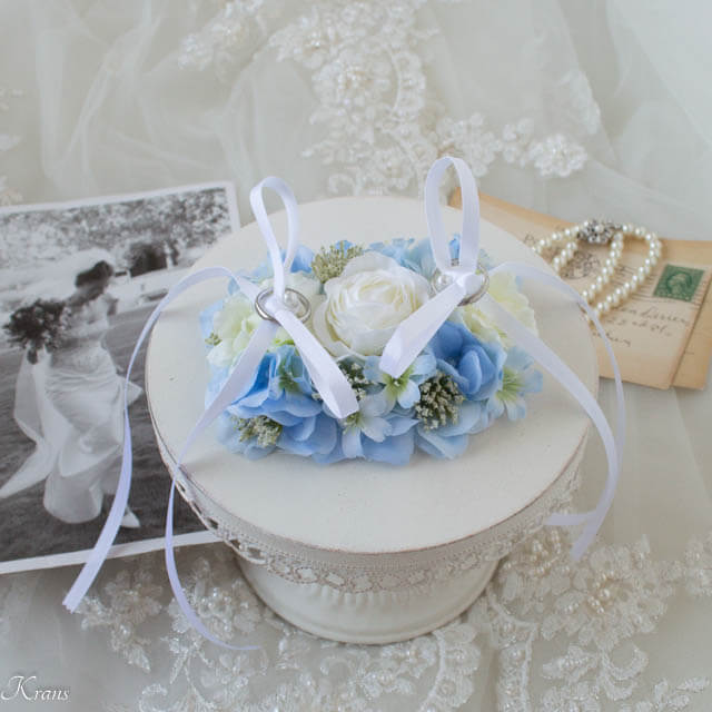 ■商品説明:ホワイトローズの花言葉は、「相思相愛」とウェディングにぴったりのお花です。そんな、ホワイトローズをメインに、ライトブルーローズを添えました。斑入りのグリーンリーフ、パステルフラワー、ライトブルーライラック、あじさいなど沢山の花々を贅沢にたっぷりと使い、上品で洗練されたデザインのリングドッグ用リングピローです。