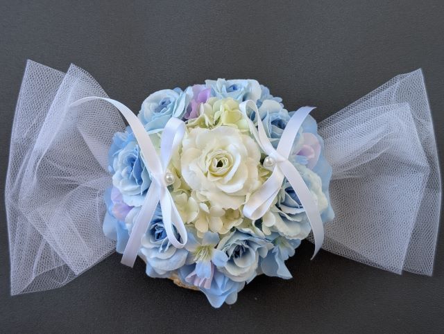 2個のコサージュ金具は、お写真のように配置する予定でございます。ご希望が、ございましたらお申し付けください。(リングピロー土台直径14cm/金具最長約5cm)