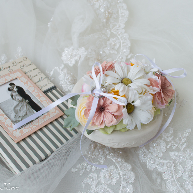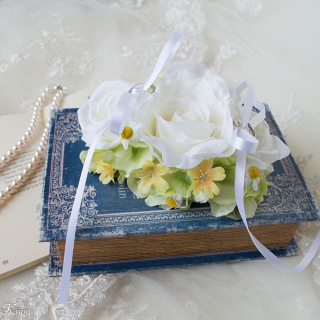 ■商品説明:ホワイトガーベラをメインに、美しいホワイトローズを添えました。淡いグリーンやホワイトアジサイ、やさしいイエローの小花をお花合わせし、優しい風を感じるようなナチュラルで幸福感漂うリングピローに仕上げています。