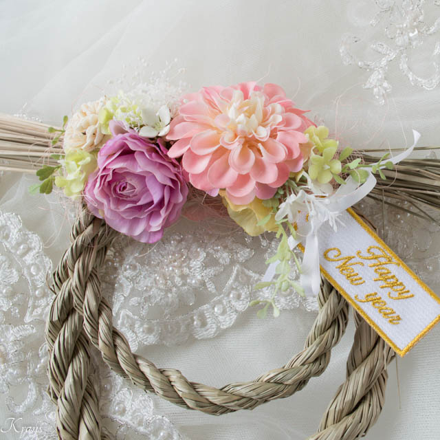 ■商品説明:ころんと可愛いピンクダリアをメインに、パープルラナンキュラス・ソーラーローズ・あじさい・かすみ草・スノーボール・ホワイトローズをアレンジしたやわらかな色合いが可愛らしいお正月飾りです。