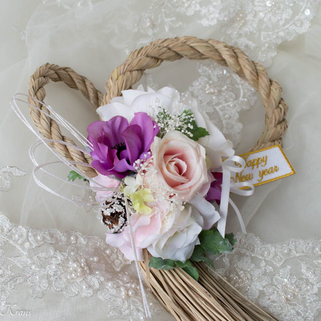 ■商品説明:クリームカラーのローズをメインに、パープルアネモネ・ベビーピンクローズ・松ぼっくり・アジサイ・かすみ草をアレンジした優しく幸福感あふれるのお正月飾りです。