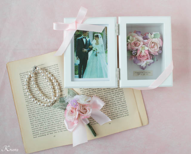 Krasnでは、フォトフレームをご注文くださったお客様へ、同じお花を使ったブートニアのプレゼントをしております。