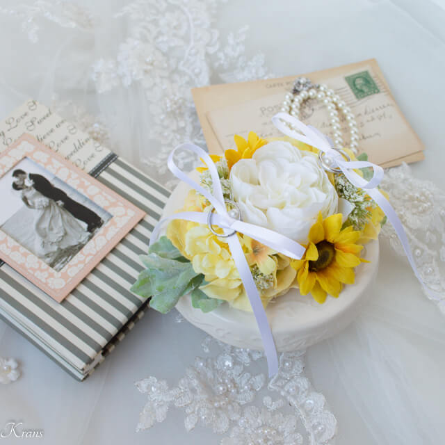 103. 八重咲きホワイトローズとひまわりのリングドッグ用リングピロー