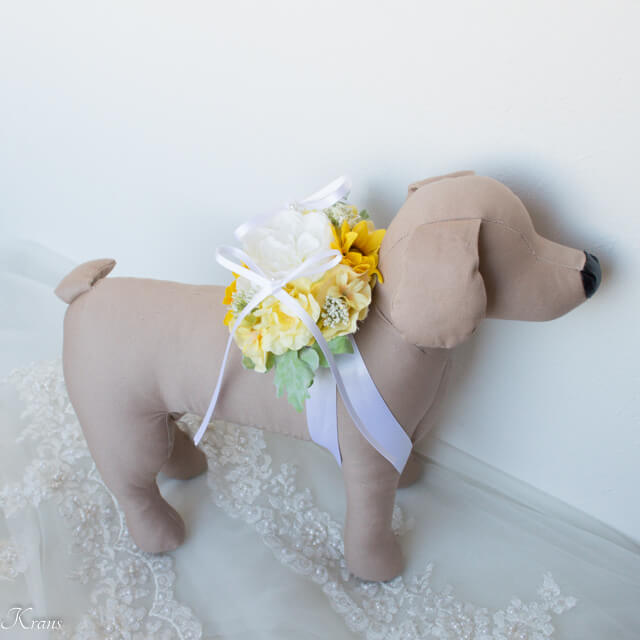 ■商品説明:八重咲きのホワイトローズをメインフラワーに、前後に小さなひまわり、左右には優しい色合いのイエローバンクシアローズをお花合わせしました。レースフラワーや小さなイエローパステルフラワー、あじさいなど沢山の花々が美しく、見る角度によって様々な表情を楽しむことの出来るリングドッグ用リングピローです。
