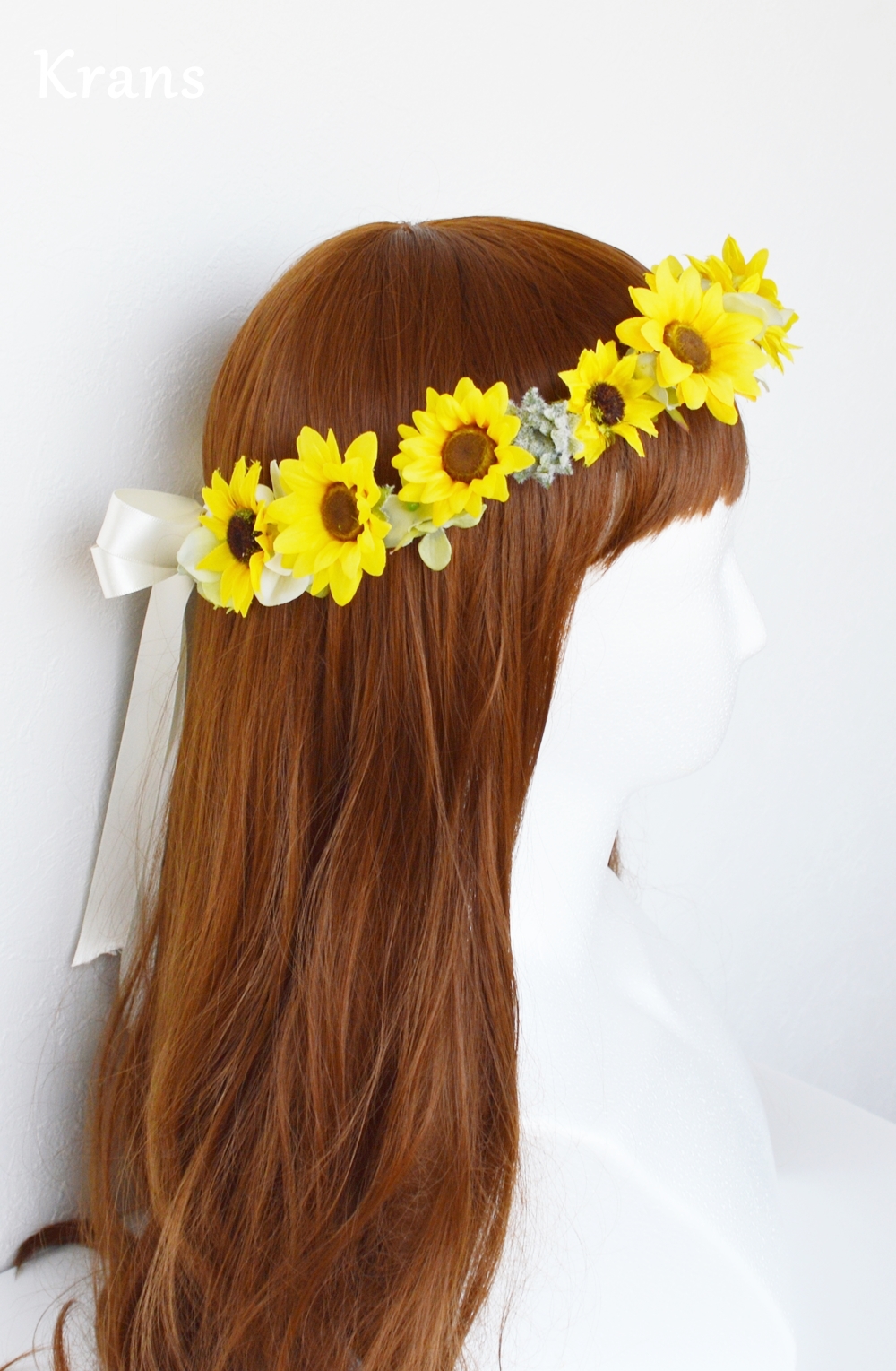 サマーウェディングにぴったりのひまわりの花冠です。シーズンフラワーを、ウェディングシーンに取り入れたコーディネートは、ゲストの皆様にも印象深く、いつまでも想い出に残ります。ひまわりのように笑顔のあふれる1日となる事間違いなしです。ひまわりには、とてもこだわりました。2種類のひまわりを使用する事で、生き生きとした動きのある花冠に仕上がっております。また、淡いアジサイをお花とお花の間に取り入れ、メリハリのある花合わせになっています。後ろ姿もリボンスタイルで美しく、サイズ調節もお好み通りです。ご新郎様用にブートニアもご用意してありますので、お2人の素敵なコーディネートを楽しむことが出来ます。花冠に使用している全てのお花にアーティフィシャルフラワーを使用しておりますので、耐久性があり、ヘアメイクのリハーサル・結婚式の前撮り・結婚式の当日・二次会まで安心して使用出来ます。お花のサイズも、花嫁さまがより美しく見える大きさで、使い勝手のよい花冠になっております。「Krans花冠の5つの特徴」もご覧下さい。