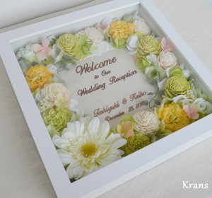 真っ白のフレームに、幸せ溢れるカラーでもある黄色のぐラデーションで花合わせを致しました。「Welcome~」の刺繍部分は、2種類(◆エレガントウェディング◆メリーウェディング)から選ぶことが可能です。